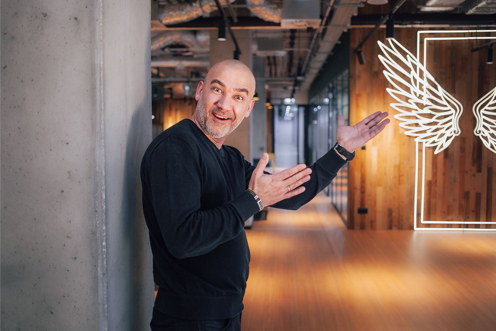 Wiktor ubrany na czarno, uśmiechnięty i wskazujący na ledowe logo skrzydeł